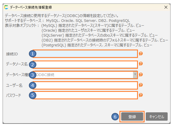 作成いただいたODBCデータソースを②のデータソース名に指定いただき接続を行うことになります。