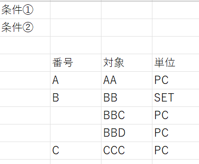 図のように、まずは条件①と条件②をキーにして、「番号」、「対象」、「単位」を取得します。もし「単位」はSETの場合、該当レコードの下に「対象」をキーにして、「対象」と「単位」を取得したいです。また、2回目取得したデータを右揃えにしたいです。