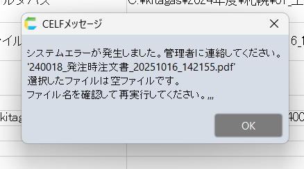 シートをPDFに保存したとたんにCELFサーバーにアップロードするとエラーが発生しました。”選択したファイルは空ファイルです。ファイル名を確認して再実行してください。”とエラーメッセージが出てきています。