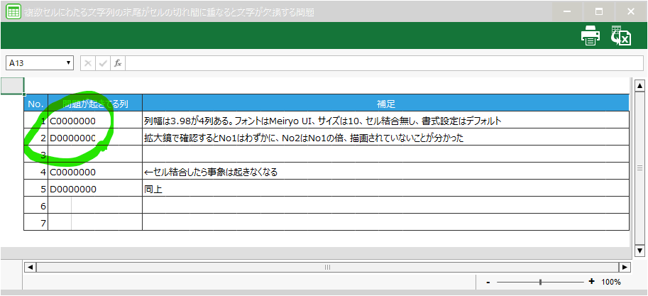 複数列にまたがって文字列を表示させると、文字列の長さによっては末尾がわずかに切れてしまいます。