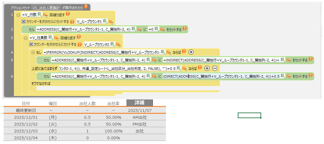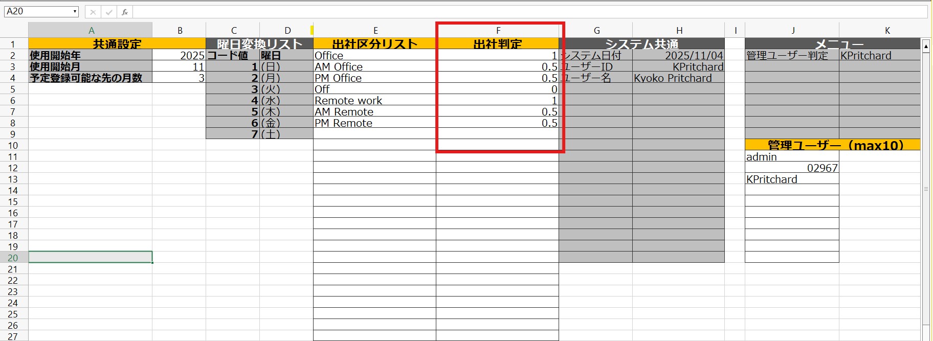 前提:設定_共通シートでは出社区分リストで半日勤務とする場合の出社判定を0.5に設定しているものとします。例 出社区分リスト→AM出社:出社判定→0.5