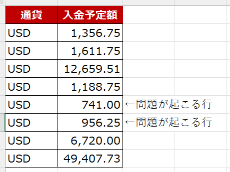 金額列の上下の行は正しく転記されており、問題が発生するのは一部の行のみです。