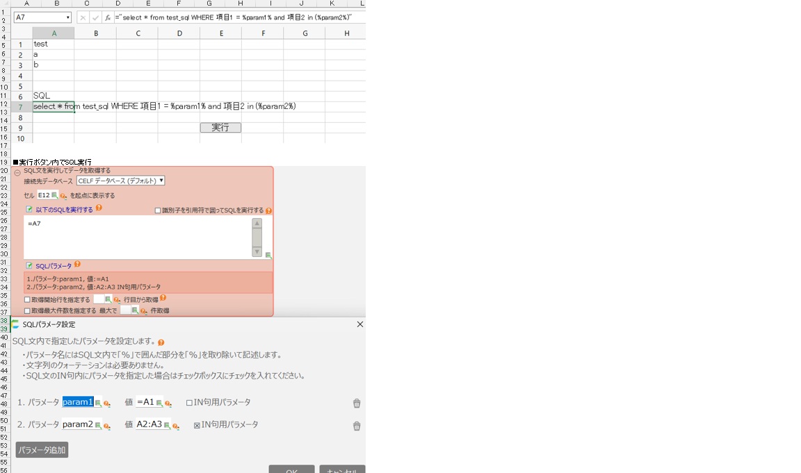 SQL実行について、セル(A1)にWHERE条件(col1='test' AND col2 IN ('a','b','c'))が設定されており、